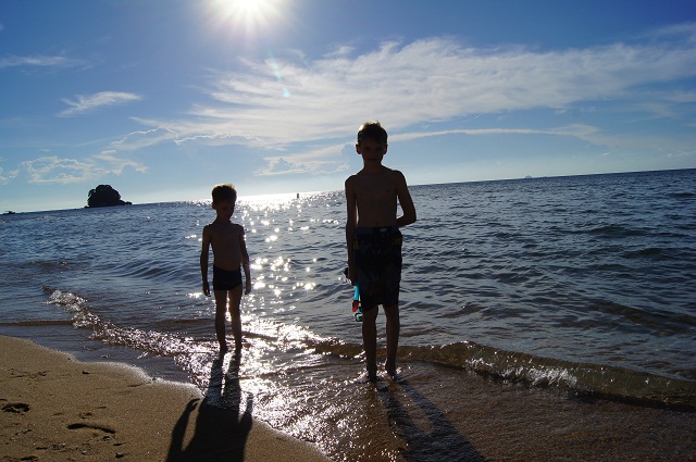 Tioman eiland is een snorkel en duikparadijs. Dus uiteraard moeten wij dat ook eens proberen. Bij het passen van de brillen en flippers hebben we Sverre al in tranen. Het elastiek trekt aan zijn haar en het is niet fijn dat je geen adem kan halen door je neus. We laten ons afzetten met een bootje op een houten vlot, dat vlak voor een klein onbegaanbaar eiland ligt. De man van het bootje meldt dat hij gaat lunchen en over twee uur terug komt. Maar dat lijkt ons wat lang, we vragen hem een collega te sturen over een uurtje. We worden alleen gelaten terwijl ik op een les: “snorkelen voor dummies” had gehoopt. Ik trek mijn flippers aan en zet de bril op, die meteen vacuüm zuigt over mijn neus, ook ik vind het geen fijn gevoel dat ik niet door mijn neus kan ademen. Zeer dapper laat ik me van het vlot afglijden, waarna ik me meteen heel onhandig voel door de flippers. Je kunt geen schoolslag doen en dat is nu net de slag die ik het beste kan. Maar dapper als ik ben laat ik het vlot los en zwem een meter van het vlot af. Ik stop mijn hoofd onder water en adem rustig door mijn mond door de snorkel. Rustig ademhalen is de enige tip die ik meegekregen heb. Nog geen tien seconden ben ik onder water of ik voel een paniek in mijn hele lijf en hoofd. Een paniek dat ik zal zinken, dat ik geen adem kan halen. Ik kom omhoog en spartel terug naar het vlot. “Ik kan het niet” stamel ik. Snel trek ik mijn flippers uit en gooi ze op het vlot, ik klim op het vlot, wat nog niet eenvoudig is omdat ze het trapje te hoog hebben gemaakt. In de brandende zon zit ik op het vlot en heb besloten dit niet meer te zullen proberen. Ik ben nooit goed geweest in onder water zwemmen, eigenlijk niet eens in zwemmen. Ik houd er ook helemaal niet van. Ik mocht ook nooit op voor mijn B diploma omdat ik de zes meter onder water niet kon halen. Mijn kinderen moeten voor het A diploma al drie meter kunnen en voor de B zes, hen lukt het wel. Zij gaan ook voor het C diploma en zijn echte waterratten, dit hebben ze duidelijk niet van mij. Dat ik toen ik jong was tot twee keer toe ben ondergeduwd en proestend en doodsbang boven water kwam heeft denk ik ook nog steeds zijn effect in mijn angst. Dit komt nooit meer goed, voor mij geen snorkeltrip naar het mooie koraal en de mooiste vissen. Brian en Myron bekijken de bodem grondig. Sverre zwemt zonder bril en ik zit op het bloedhete vlot te wachten tot het bootje ons weer komt ophalen. Myron en Brian zullen over een uur echt duikles krijgen, terwijl ik me naast het zwembad neerzet en Sverre er in. Maar na de duikinstructies, net voordat ze het water in zouden gaan, wordt Myron ziek, misselijk, overgeven en duizelig. Brian en Myron balen, ze hadden er echt zin in, maar er zit niks anders op dan terug naar het huisje gaan. Bijkomen in de airconditioning. Ik ben echt een landrot, dat is duidelijk. Maar mijn gezin zijn echte waterratten, zij zullen zeker nog gaan snorkelen en duiken, is het niet deze vakantie dan is het wel een volgende. Ik zal aan de kant zitten, pas op de tassen, maak foto’s en zal een heerlijke cocktail uitproberen. Koraal en vissen zal ik bewonderen in boeken en op foto’s.